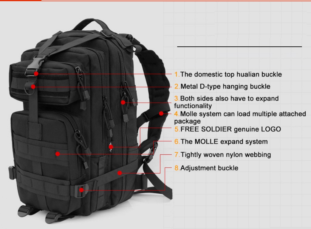 Αυτό το Στρατιωτικό Σακίδιο θα σας επιτρέψει να ξεκινήσετε την επόμενη βόλτα σας, το ταξίδι κάμπινγκ ή την εκστρατεία κυνηγιού με ότι χρειάζεστε. Ένας αγκιστροειδής κρίκος στην κορυφή, σε συνδυασμό με τα μπροστινά τμήματα φερμουάρ αποθήκευσης, εξασφαλίζει ότι τα πρακτικά πράγματα όπως ένα καινούριο ζευγάρι κάλτσες, είναι εύκολο να αρπάχτει χωρίς να εκφορτώσετε ολόκληρο το σακίδιο σας στη μέση του μονοπατιού. Οι ζώνες ώμου με ρυθμιζόμενους ιμάντες και ρυθμιζόμενες θήκες, καθώς και το αναπνεύσιμο πλέγμα, επιτρέπουν τη μέγιστη άνεση μεταφοράς ακόμη και όταν πετάτε στους λόφους.