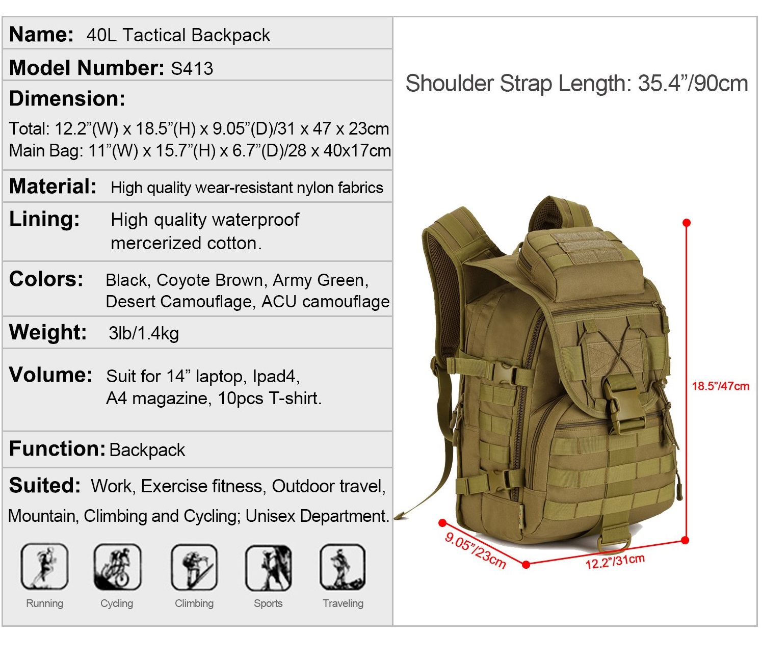 Υλικό: Υψηλής έντασης στρατιωτικό στυλ προδιαγραφές 1000D νάιλον, ανθεκτικό και αδιάβροχο, δεν είναι εύκολο να σκιστει.