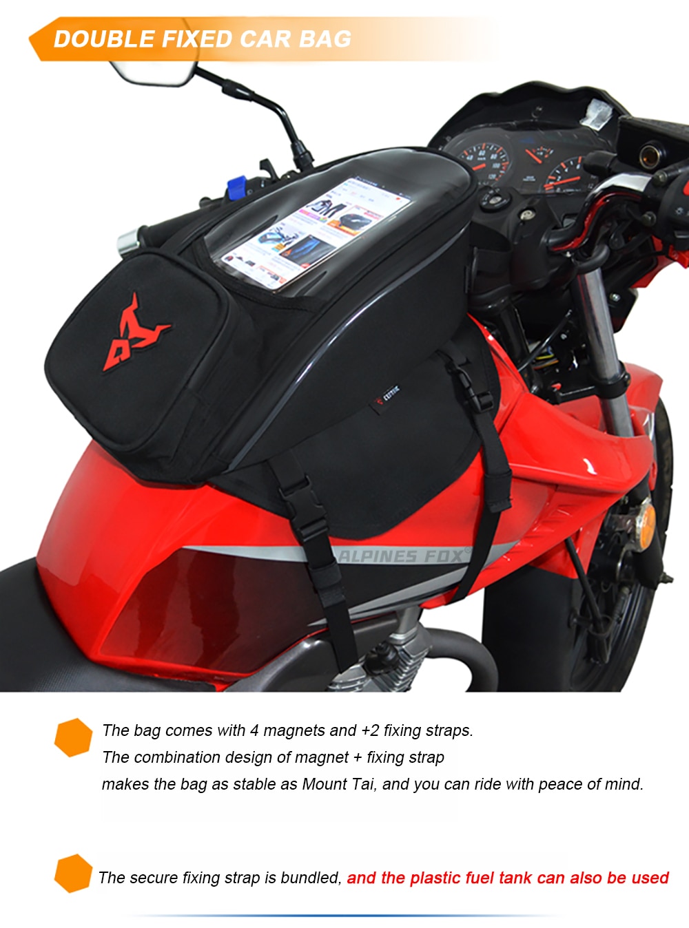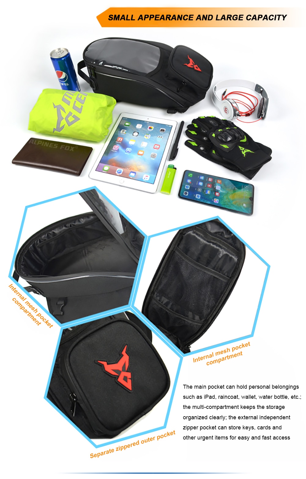 Είναι κατασκευασμένο από υψηλής ποιότητας αδιάβροχο ύφασμα Oxford, το οποίο είναι ανθεκτικό στη φθορά, αδιάβροχο. Ο χώρος μεγάλης χωρητικότητας μπορεί να αποθηκεύσει κινητά τηλέφωνα, ρούχα, κράνη και πολλά άλλα.