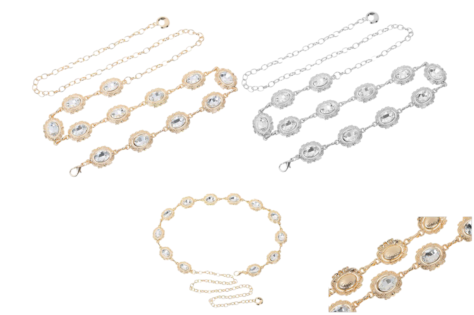 Αναδείξτε τη μέση σας με τη λαμπερή ζώνη-αλυσίδα από τη συλλογή. Διακοσμημένη με εντυπωσιακά κρύσταλλα και διαθέσιμη σε χρυσό και ασημί, προσθέτει μια πολυτελή πινελιά σε κάθε εμφάνιση—ιδανική για φορέματα, ψηλόμεσα παντελόνια, ακόμα και βραδινά σύνολα.