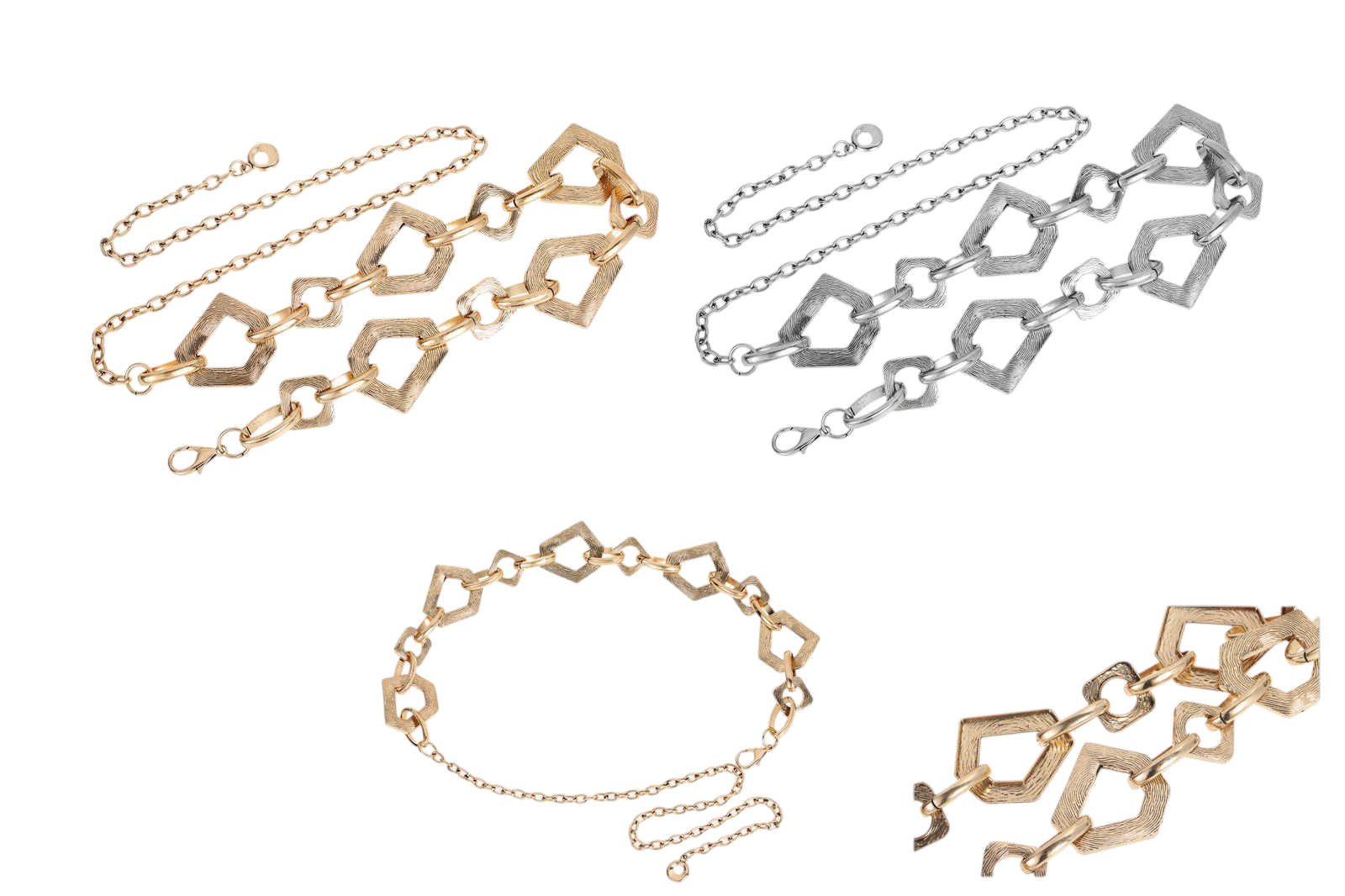 Αναδείξτε τη μέση σας με τη λαμπερή ζώνη-αλυσίδα από τη συλλογή. Διακοσμημένη με εντυπωσιακά κρύσταλλα και διαθέσιμη σε χρυσό και ασημί, προσθέτει μια πολυτελή πινελιά σε κάθε εμφάνιση—ιδανική για φορέματα, ψηλόμεσα παντελόνια, ακόμα και βραδινά σύνολα.