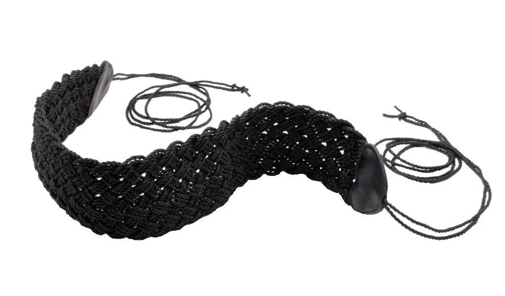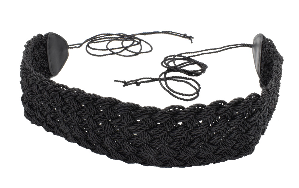 Αυτή η πολύ φαρδιά και πλεχτή ζώνη είναι κατασκευασμένη από συνθετικό δέρμα υψηλής ποιότητας μαύρου χρώματος και δένει πίσω από την πλάτη με κορδόνια.